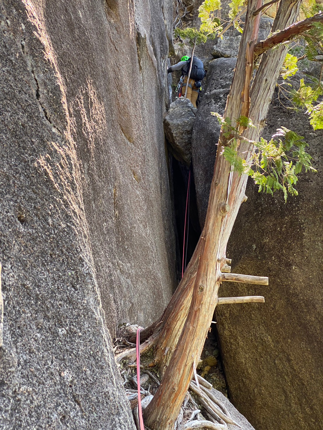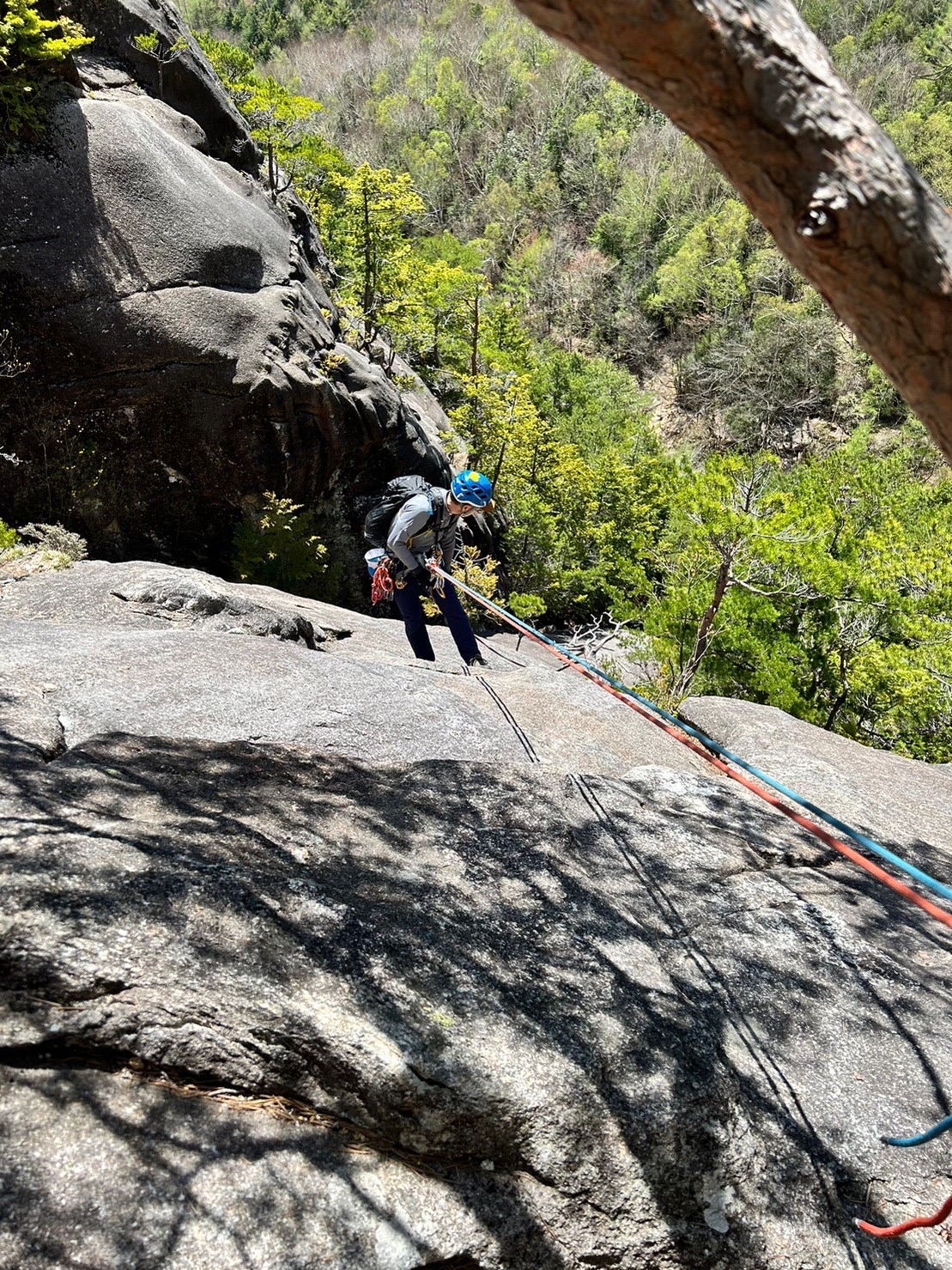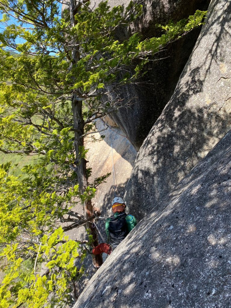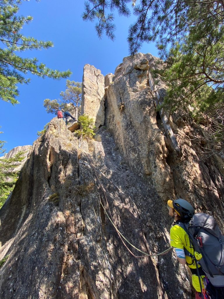 Yの字をした立ち木脇のクラックからスタート。クラック下部で4番のカムを打ちやっぱり持ってきて良かったと思った笑。ハンドジャム、フィストジャムを上手く効かして左のスラブへ移ってマントル返しのチムニー登り。終了点の立ち木に、前パーティがビレイをして取り付けないので、スラブ手前でセルフし、また長待ち。