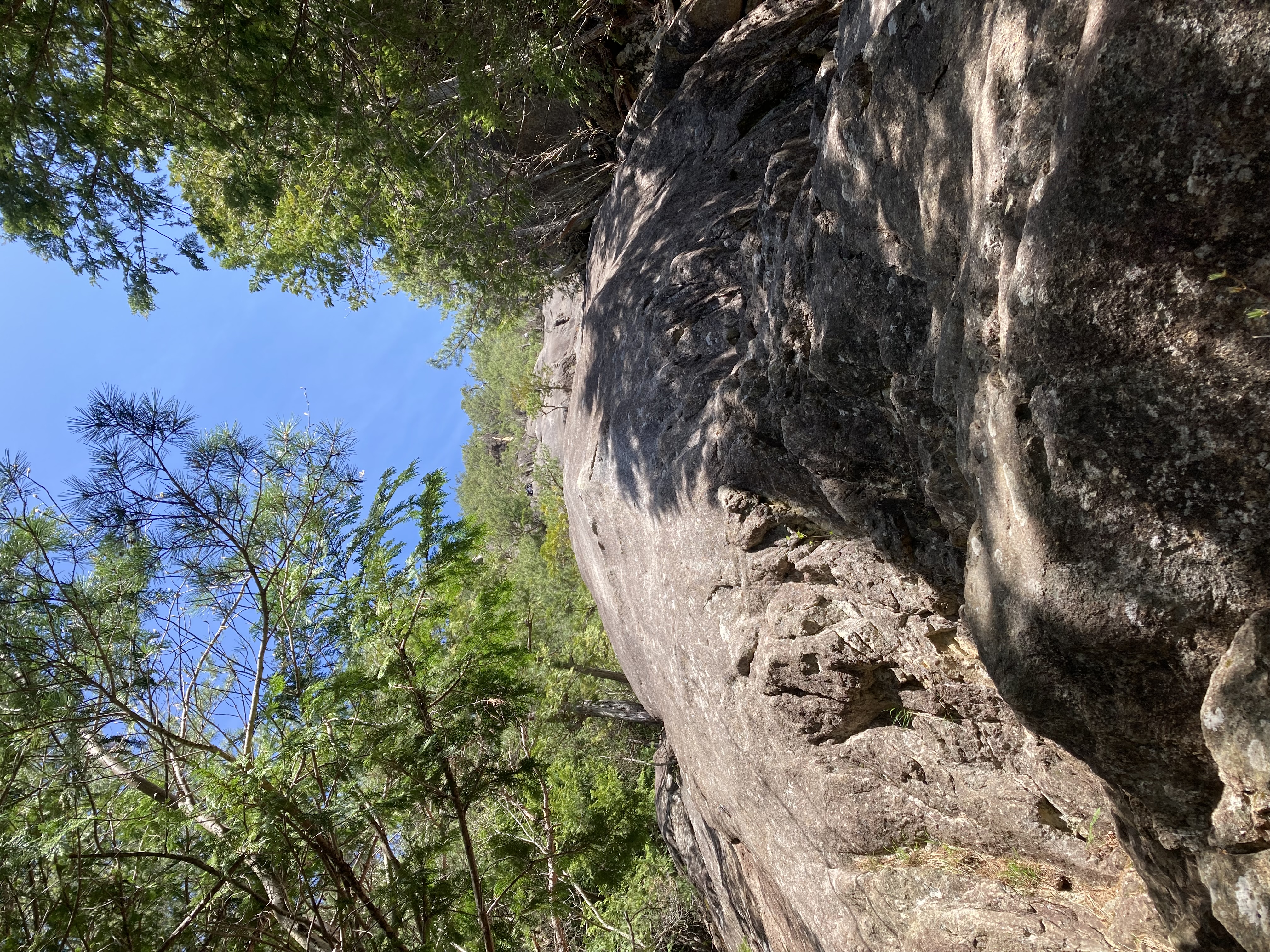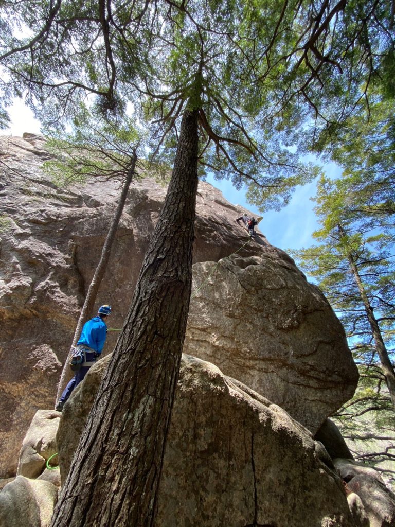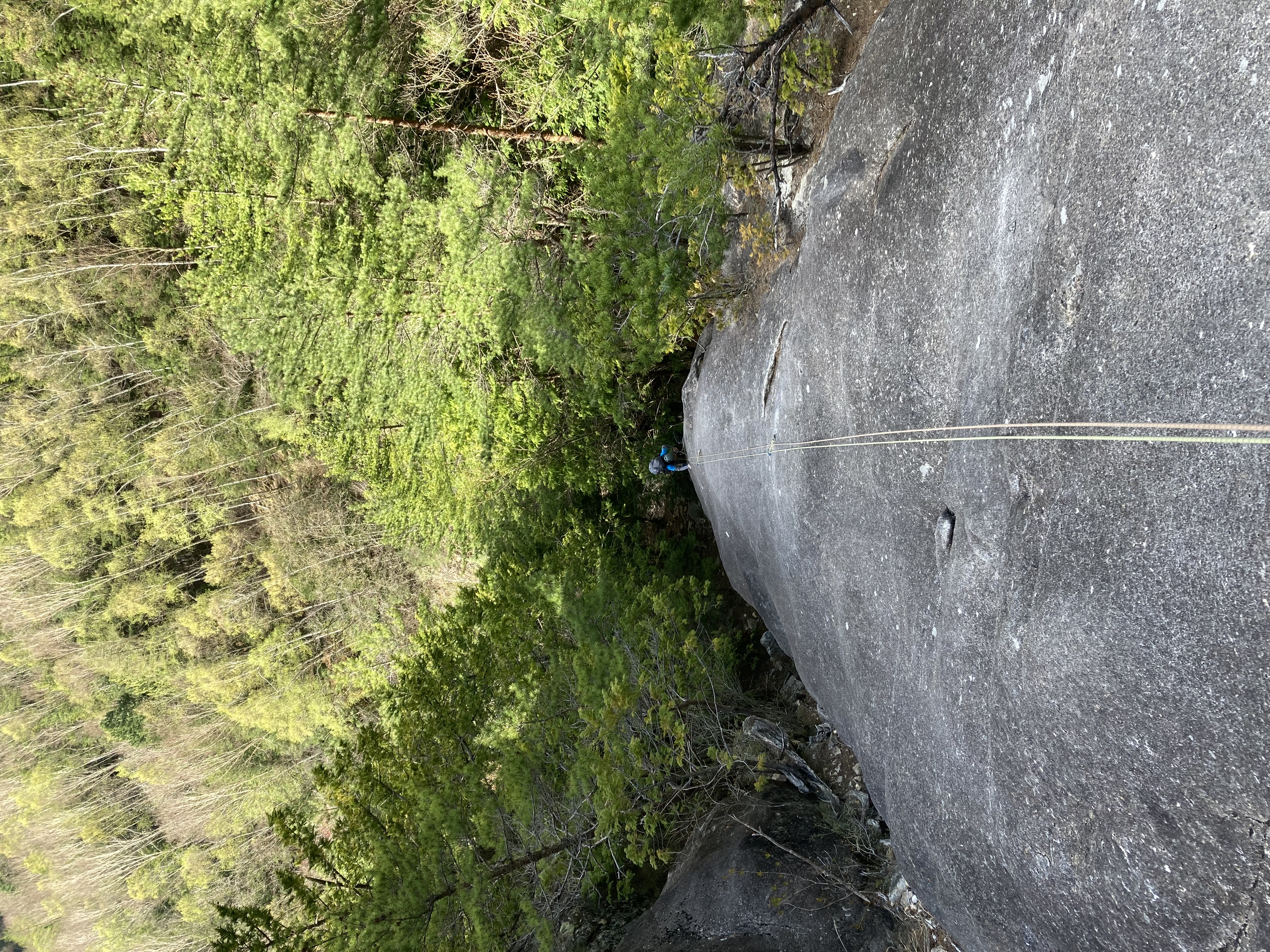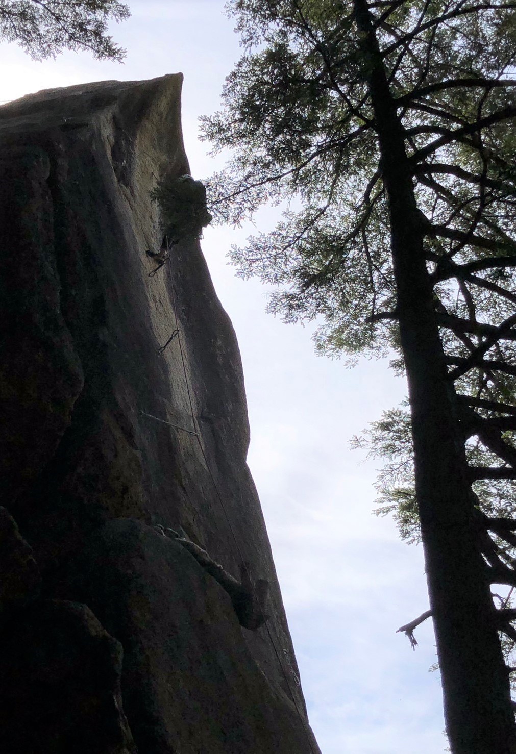 Yの字をした立ち木脇のクラックからスタート。クラック下部で4番のカムを打ちやっぱり持ってきて良かったと思った笑。ハンドジャム、フィストジャムを上手く効かして左のスラブへ移ってマントル返しのチムニー登り。終了点の立ち木に、前パーティがビレイをして取り付けないので、スラブ手前でセルフし、また長待ち。
