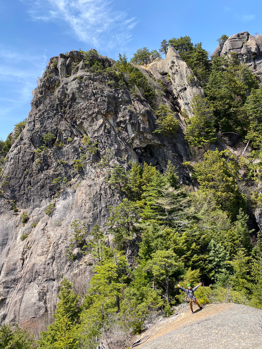 < 父岩 ド真ん中のラインが小川山物語 5.10a 、スッキリとしたスラブのライン。