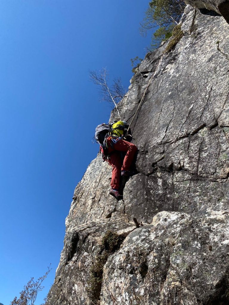 短いピッチで目の前を一旦上まで上がってトラバースするが、間のスラブが案外悪い。木にプロテクションをしっかり取って行く。