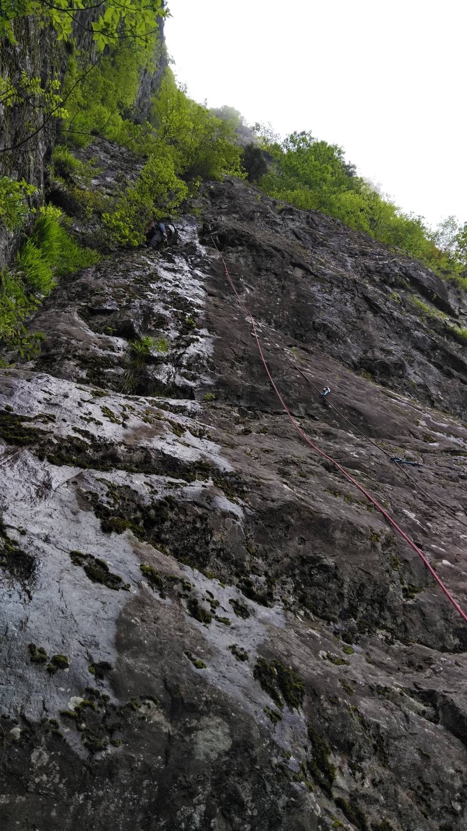 ノープロのピッチ。「濡れて滑るから気をつけてね」と私達に声をかけ、登っていく。