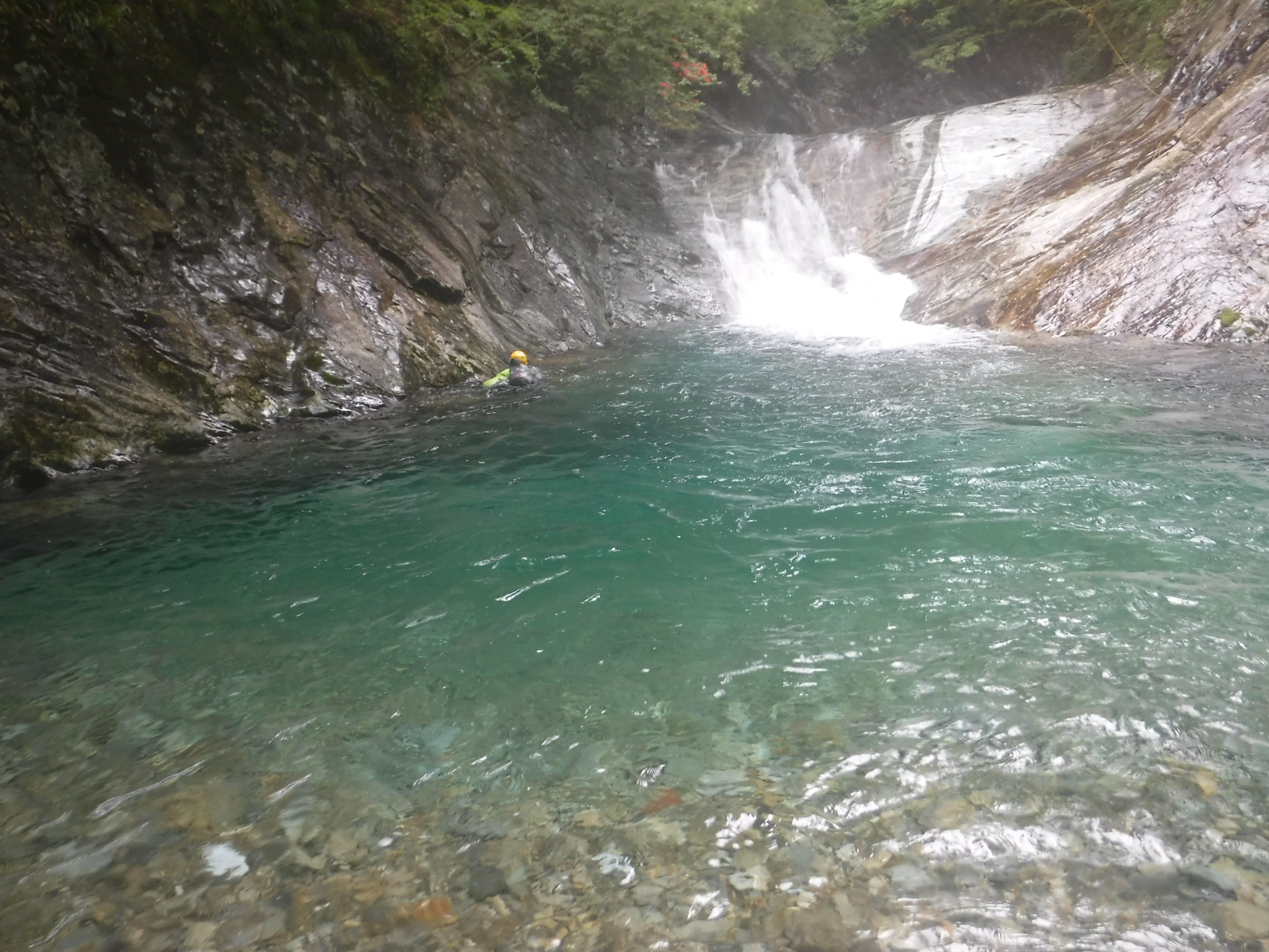 40分ほど林道歩きをして入渓する。やはり想像以上の水の冷たさ。こちらは冷たさに悲鳴を上げそうになっているのに、Mさんは腰のあたりまで水があるところに進み、いきなり頭から突っ込んで仰向けに浮かび上がっては「がはははは!」と喜んでいる。さすが仙人。