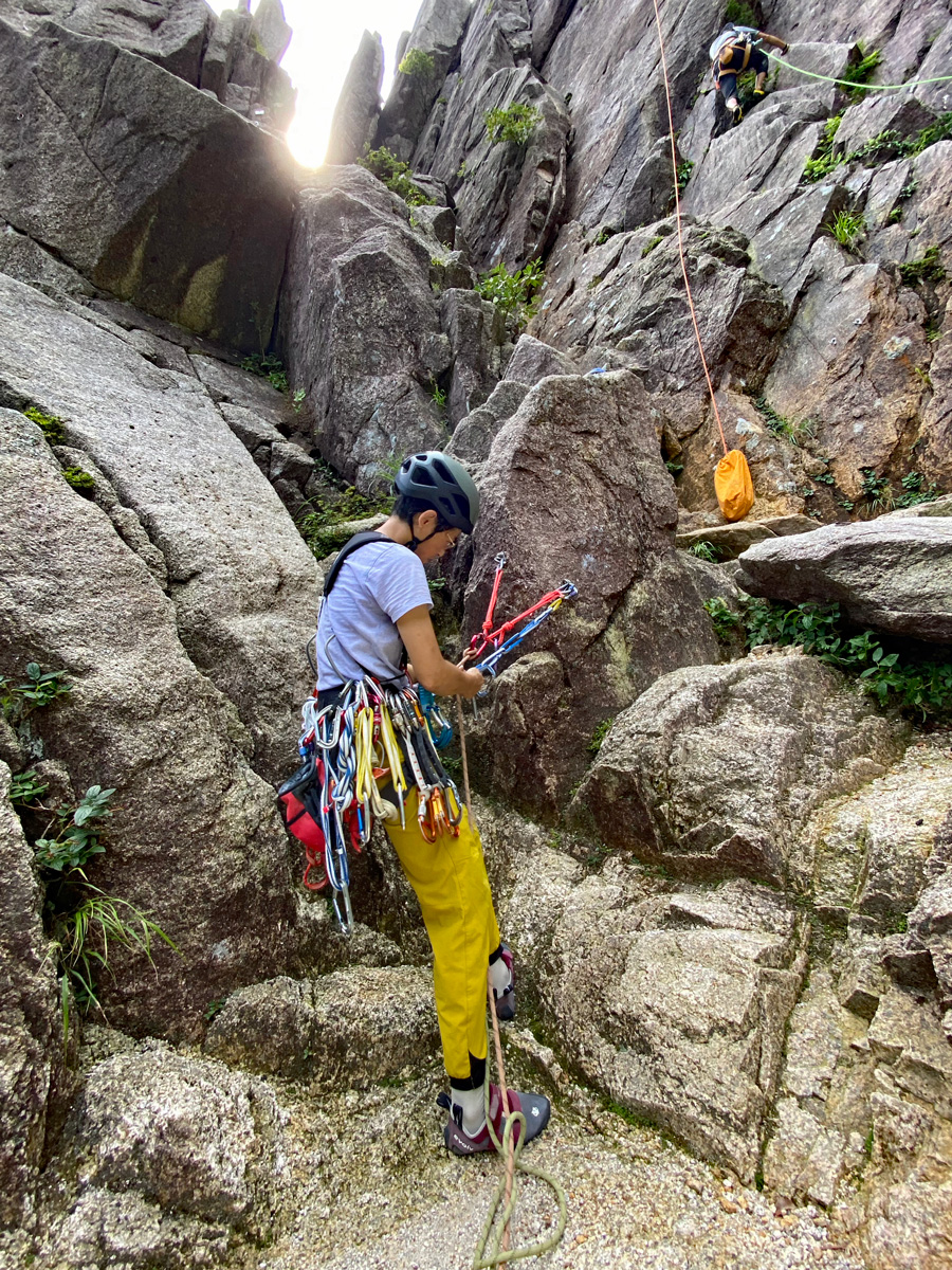 今年春からマルチピッチの練習に取り組むクライミング初心者の私は、前回の練習から間が開いていたので、まずはロープワーク、セカンドのビレイの仕方、支点構築などをおさらいし、M戸会長に確認していただきました。