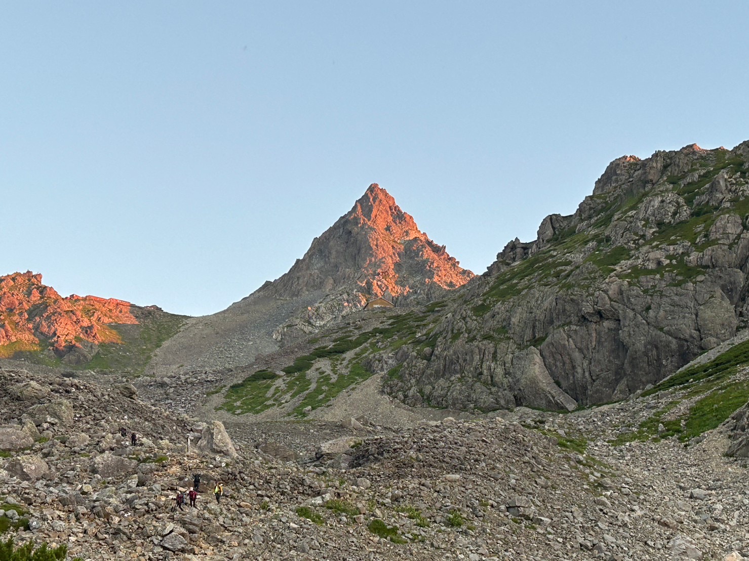 2:00に起床し、肩の小屋を経て西稜取付へ。取付まで1時間ほどとのことでしたが、ルートが不明瞭で予想外に時間を取ってしまい、取付に着くまでに3〜4時間程経過してしまいました。
