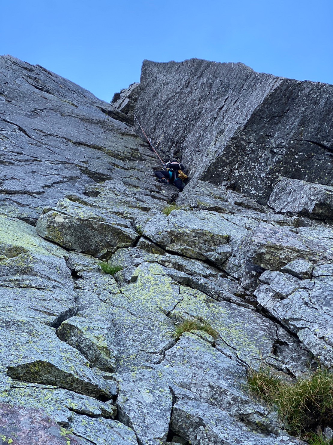 スラブ〜小ハング〜凹角は難なくクリア。ただどの岩も剥がれやすいため、一手ずつ慎重に確認しながら登りました。