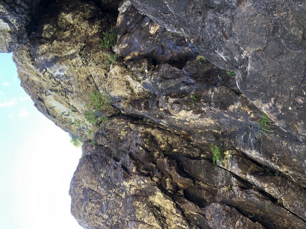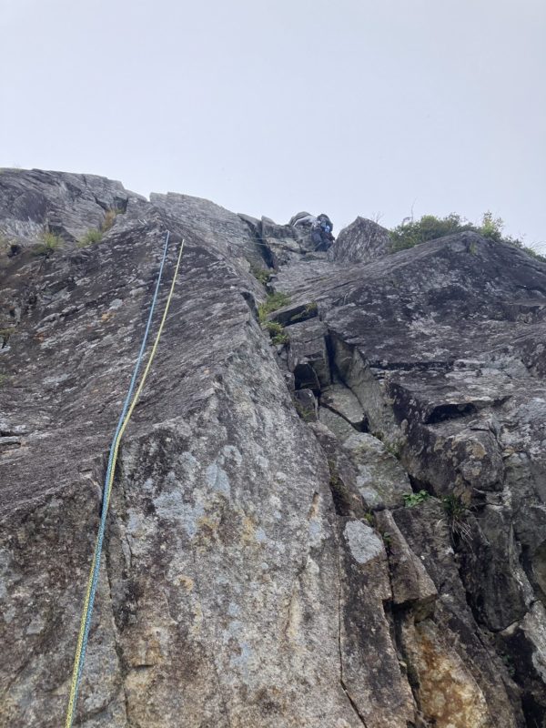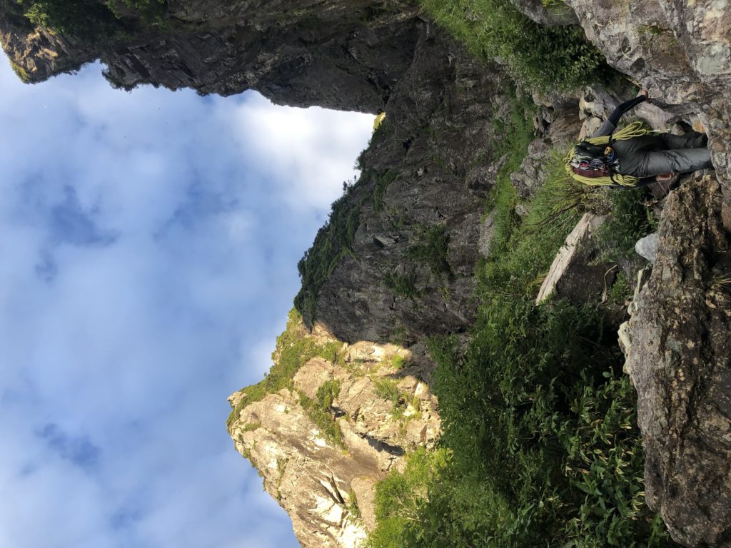 草付きのスラブ状を進む。たまに古いハーケンがあるくらいで、中間支点や終了点を取るところに苦労した。