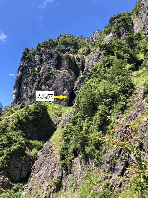 長いスラブを抜けると、稜線の反対側にようやく大洞穴が見えた。大洞穴へはいったん下降して登ることになる。ここも笹原の中を進むのでいったんアプローチシューズに履き替えて進む。