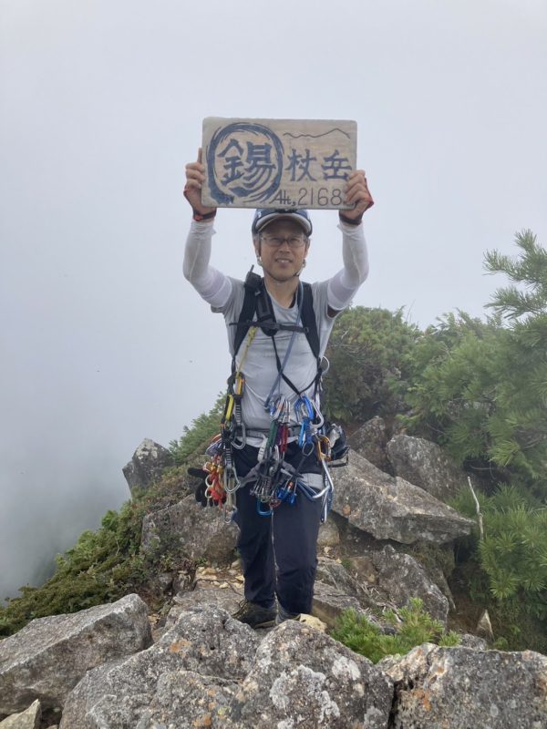 見渡すと、いくつかピークが続いているので、ロープとギアを片付けて下降路の方角へ進んでいく。案の定、隣のピークに錫杖頂上を示すピッケルが。はあ、良かった!