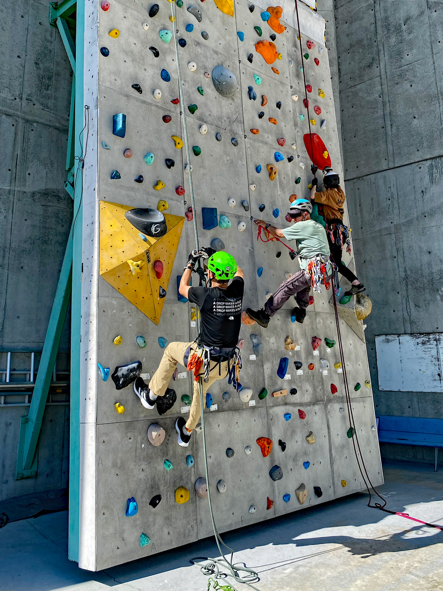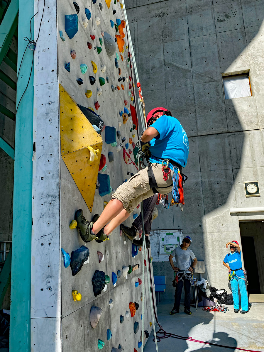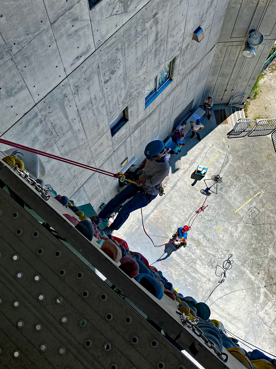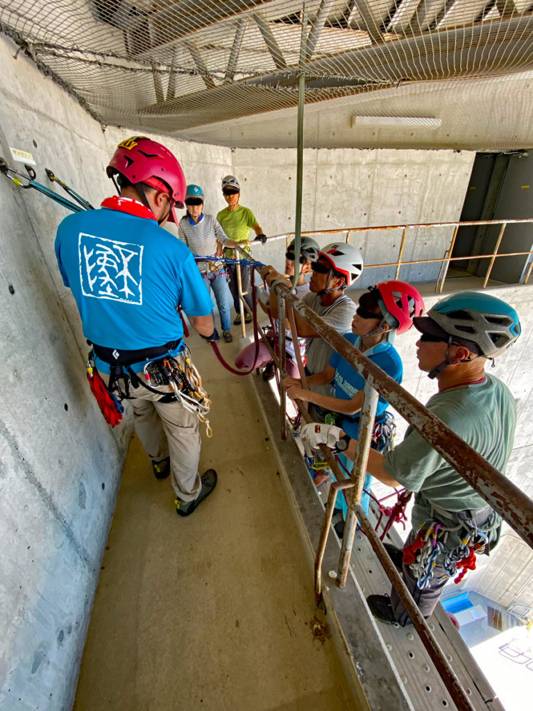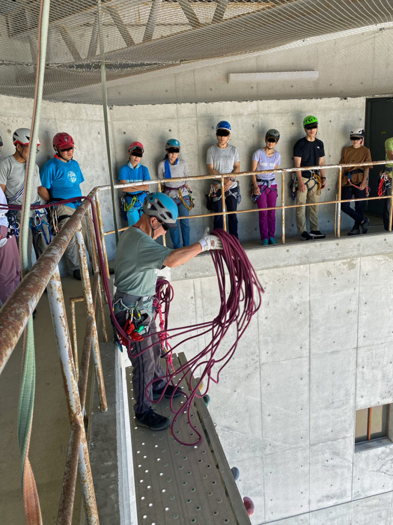 次に人工登攀壁の最上部へ上がり、支点構築しマスターポイントの安全環付カラビナにロープを通し、懸垂下降の準備を行った。そのあと、複数人が効率よく連続して懸垂下降する方法について、主任講師から説明がありその後実践となった。
