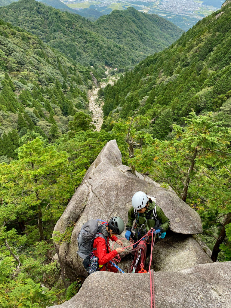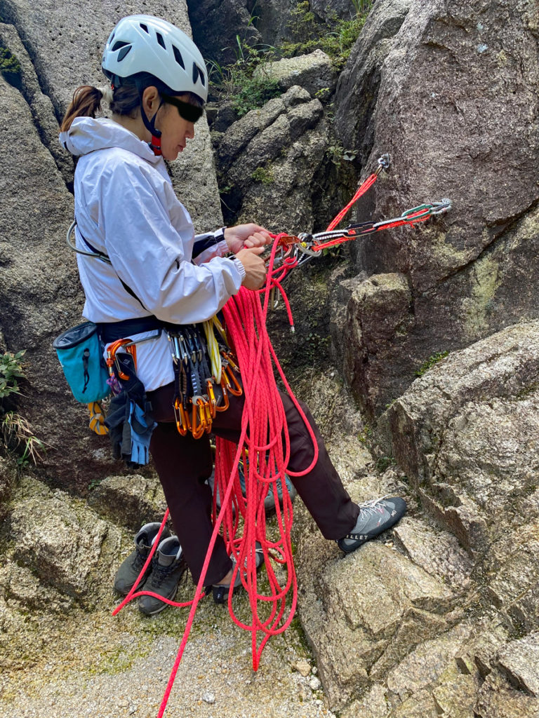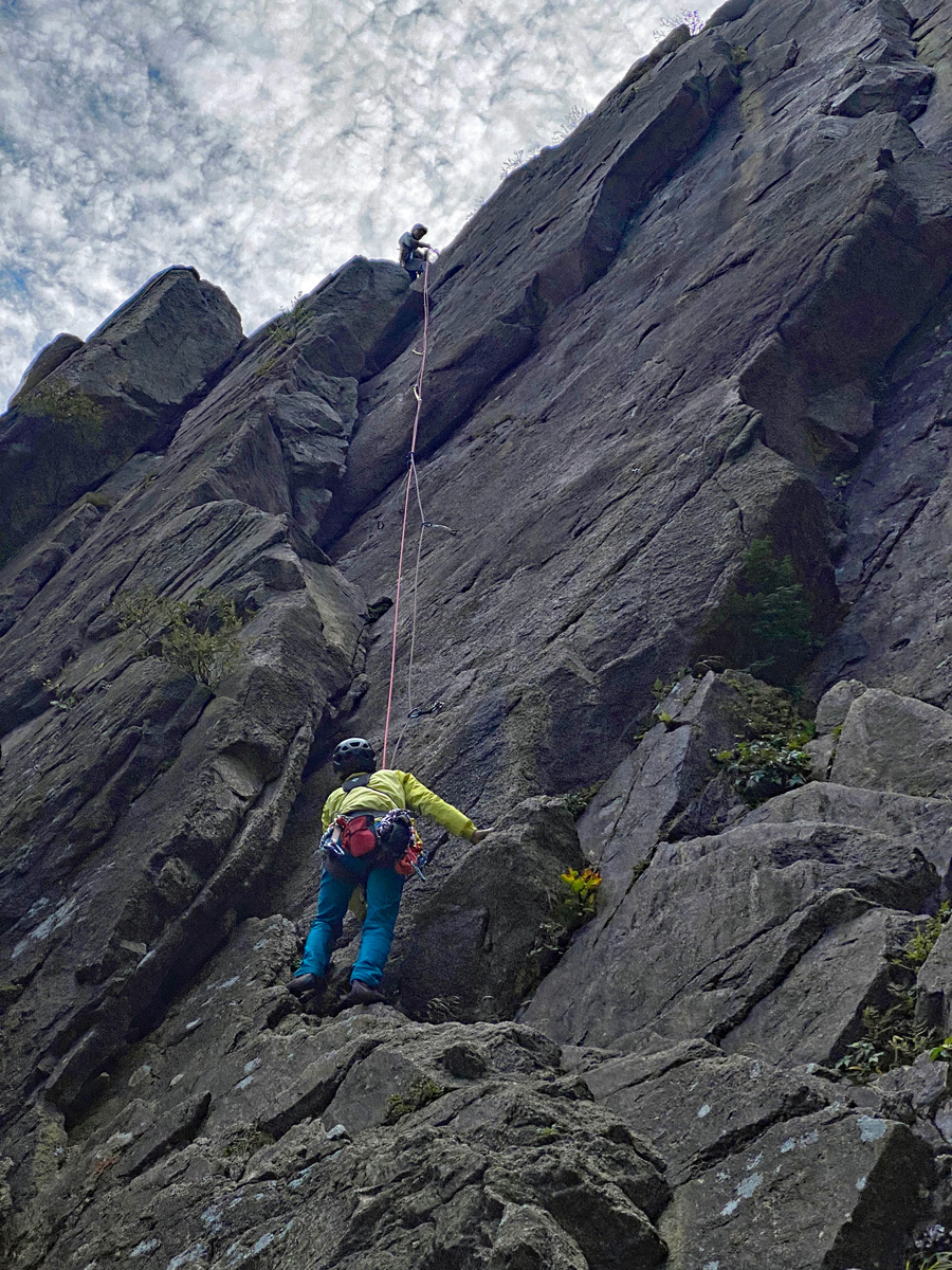 4人参加なので、I口さんとS根さん、K村さんとM戸にペア分けして登攀。今回ロープは、2日目に3人になる事も考えて、Φ8.2ダブルロープx50mの1setとΦ8.9シングルロープx50mを共同装備とした。I口さんとS根さんペアがダルブロープを、K村さんとM戸がペアがシングルロープで練習することにした。