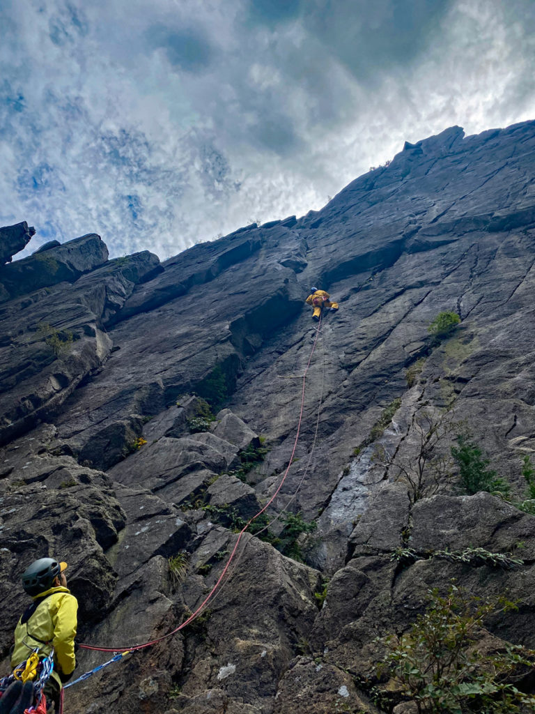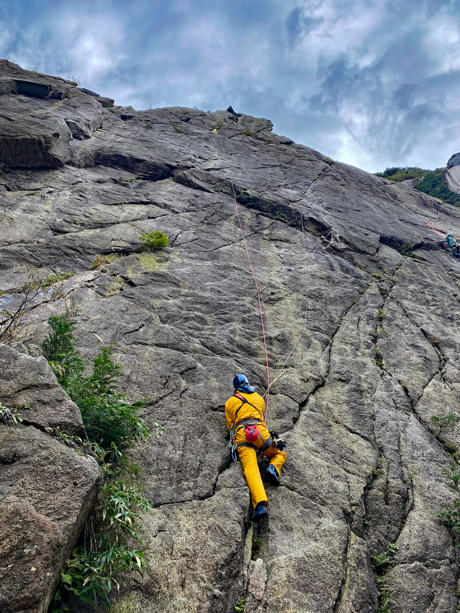 今回、二日目はお昼から雨が降ることが確実な予報だったので、P7のみを何度かマルチ登攀することにした。それにしても誰も前尾根P7の取付に来ない。天候悪いから当然か(笑)