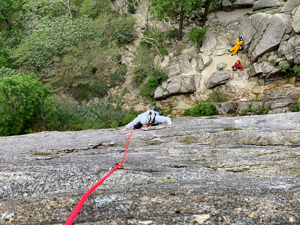 P7を細かく3ピッチに切って登攀した。そうすることでセカンド、サードで登るメンバーを細かく指導していくという算段。今回、S根さんとK村さんは、P7の2ピッチ目スタート付近にある核心部を登攀する際は、適当にごまかさず、手足の位置やムーブが掴めるように安全確保しながら何度もチャレンジしてもらった。ソロ登攀するクライマー1人以外は誰も登りに来なかったので、後から追い立てられること無く、安心してじっくり登攀練習してもらえて良かった。