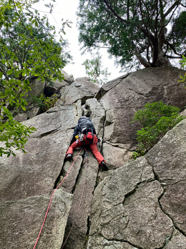 P7終了点から迂回路でP7取付へ戻り、次はS根さんにP7の1ピッチ目を初リード登攀してもらった。カム打ち練習もしてもらえて、自信をつけてもらったのではないだろうか。