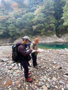 天気よく、そこまで急がなくても大丈夫だろうと、6時半に出発。山行ルートは明確の様子やし、小屋泊まりで身軽やし、個人的にはやや気を抜いて出発。軽い起伏はあるものの、登りはきつくなく快適。どんな滝が待ち受けているのかな~と少し観光気分で歩いていると、「せっかく地図持ってきたし初めてのところやから読図しながら行きますか」とⅯ戸リーダー。さりげなく訓練を入れ込み、観光気分から合宿山行であることを再認識。実際に繰り返し読図を行い、勉強になりました。
