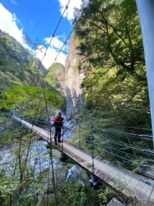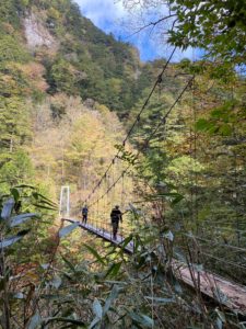 Ⅿ戸会長よりお誘いありネット検索にて大杉谷登山センターのページを見ると「日本三大渓谷」とある。大杉谷(三重県)、清津峡(新潟県)、黒部峡谷(富山県)であるらしい。谷を名字に抱く者として、昨年の秋山合宿にて黒部渓谷下ノ廊下を踏破したので二つ目を、かつ小屋泊まりなので山行不精の身(今年初山行!)でも大丈夫だろうと思い参加希望しました!直前例会にて今回参加を見送ったS根さん発案と知る。参加人数によっては昨年の下ノ廊下方式(上流発下流発と二隊に別れ途中で合流鍵交換)も検討されたが一隊で粟谷小屋往復となる。
