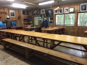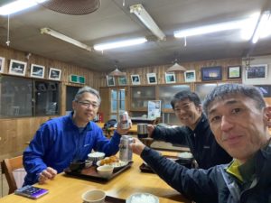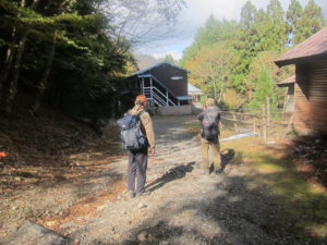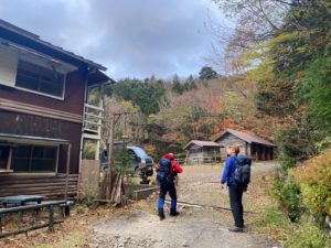 予定より1時間半程早く着いてしまったので宿主はまだ来ておらず、小屋には入れないため、屋外で待っていると、標高もあり風も当たり、一気に冷えてくる。これでは凍えてしまうとN澤さんは持参の焼酎を取り出し冷えをしのいでいると、思ったより早く宿主が到着し、早速小屋に入らせてもらう。本日は一組のみの宿泊とのことで貸し切り状態である。てきぱきと準備を整えてくれて、一杯やってから広々風呂でゆったりしっかり温まった後はホカホカ夕飯と宴会で、我が家の様にして過ごす。小屋にあった本を見て、堂倉谷に沢登りのルートがあるのを知りⅯ戸さんは興味を示していた。