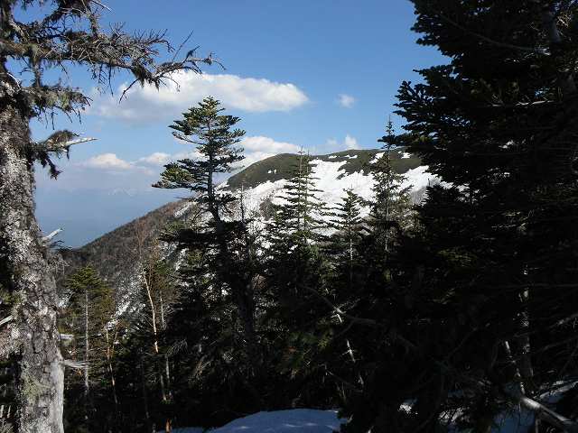 上り一辺倒で下しか見てなかったら、いつの間にか樹林の間から稜線が見える。