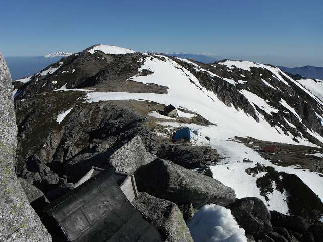 7:25 宝剣頂上から木曽駒方面 左が木曽駒ケ岳、下に見えるのが宝剣山荘