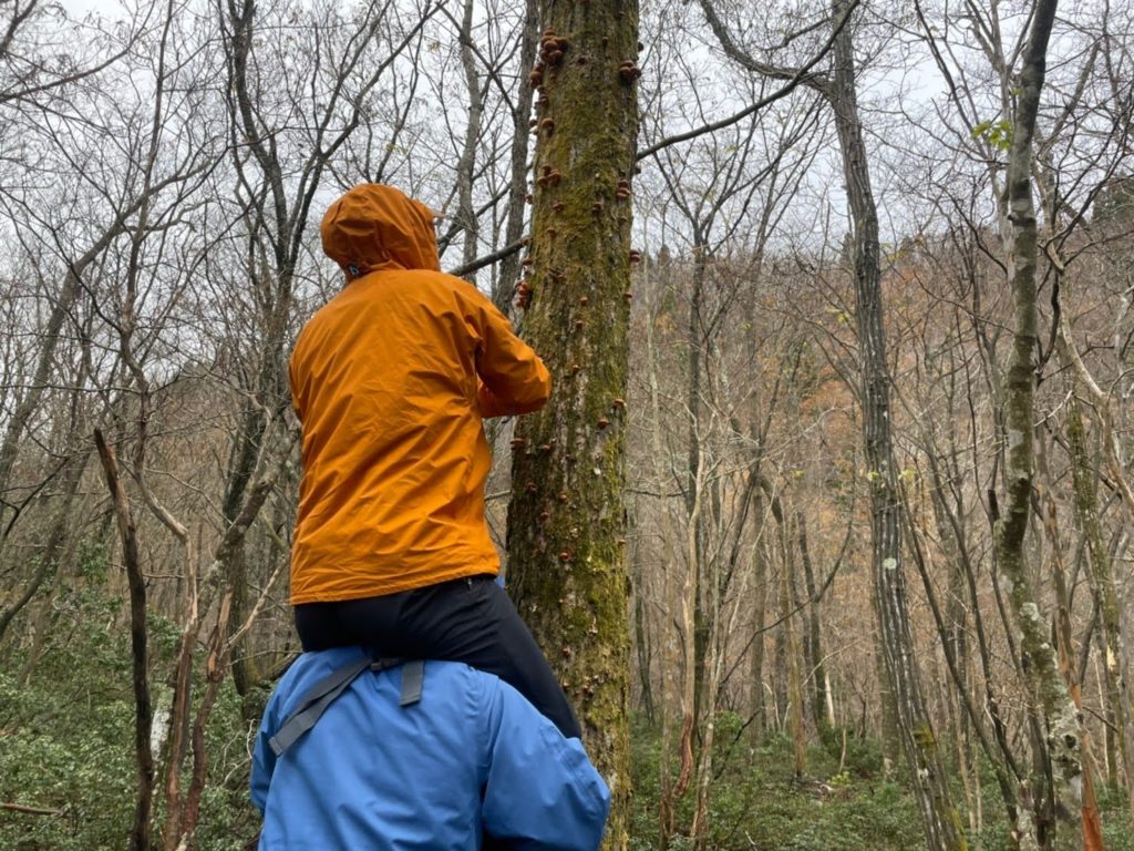 手の届かないところにいっぱいなっていたので背伸びして四苦八苦していると、「ぼくが肩車しますから!」と、Mさんが70キロ近い私をひょいっと簡単に肩車で持上げてくれた。おかげで、大量のなめこが収穫できた。