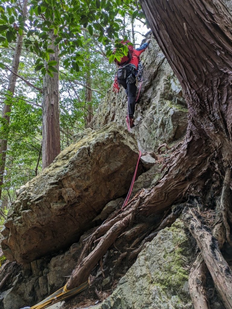 スポートルートだと支点がしっかりしているものが多いですが、このルートで人工支点となるのは錆び錆びのハーケンやリングです。立木やカムで支点を取る方がよっぽど安心できました。