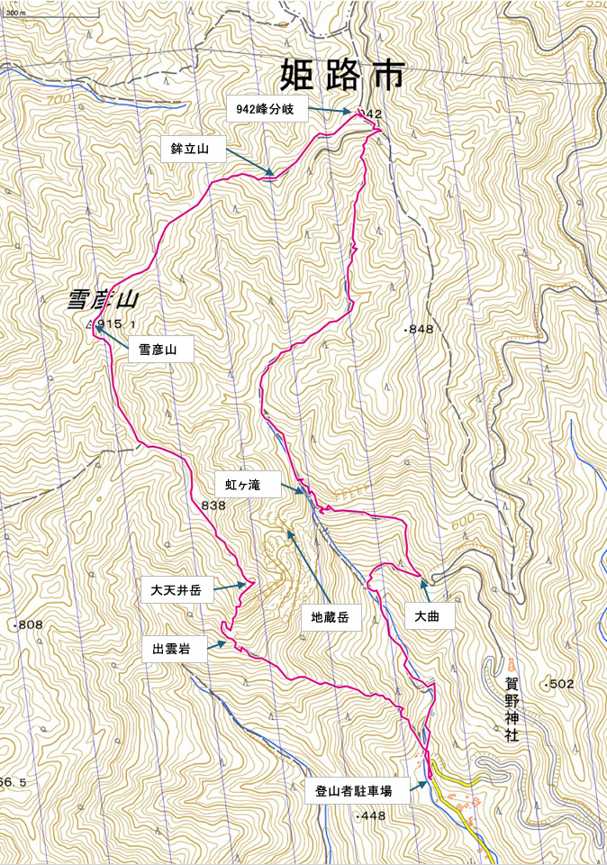 雪彦山登山者駐車場 7:50発 →出雲岩 9:02着(小休止) → 大天井岳 10:08着 → 雪彦山 10:49着(昼休憩) 11:22発 → 鉾立山 11:52着 → 942m峰分岐(小休止) → 虹ヶ滝 13:21着(小休止) →大曲 13:49着 → 雪彦山登山者駐車場 14:20着 下山
