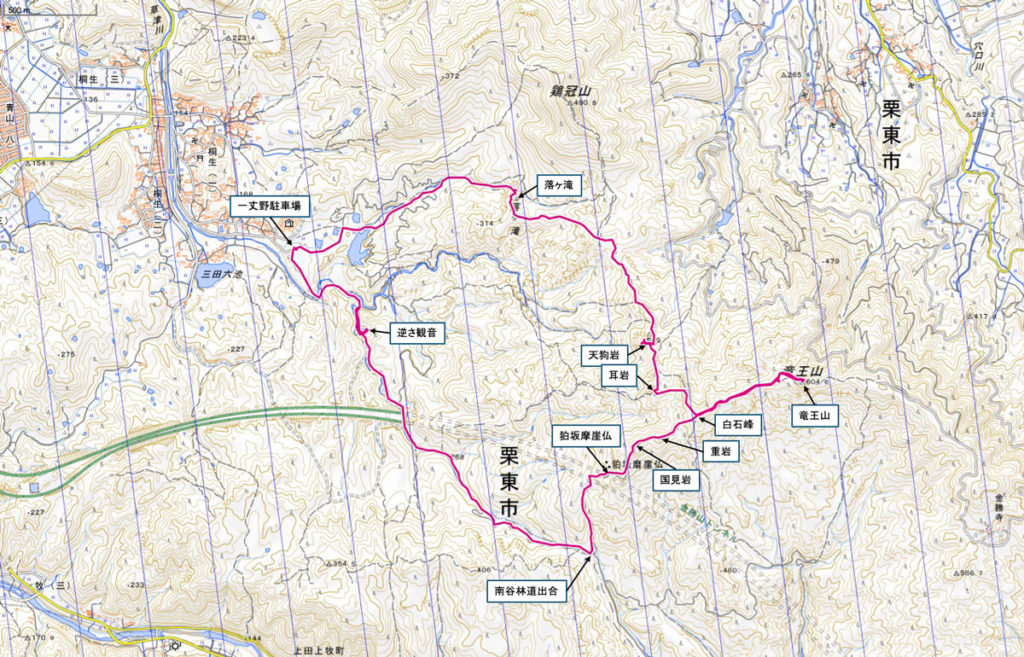 一丈野駐車場 8:05発 →落ヶ滝 8:36着(小休止) → 天狗岩 9:54着 (休憩:岩探索) 10:24発→ 耳岩 10:36着(小休止) → 白石峰 10:48着 → 竜王山11:06着(小休止) → 白石峰 11:29着(昼休憩) 11:49発 →重岩 11:54着 → 国見岩 11:58着 → 狛坂摩崖仏(こまさかまがいぶつ) 12:06着 → 南谷林道出合 12:20着 → 逆さ観音 12:51着(小休止) → オランダえん堤 13:08着(小休止) → 一丈野駐車場 13:15着 下山