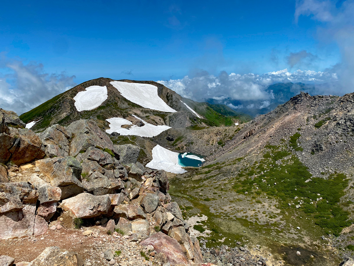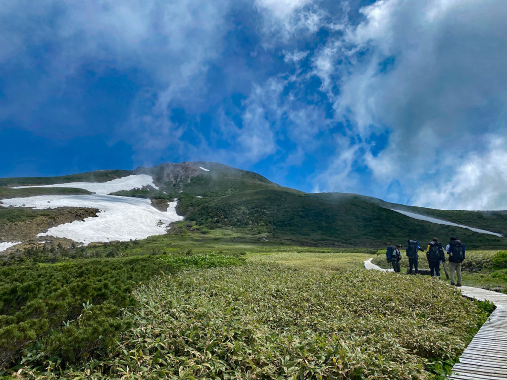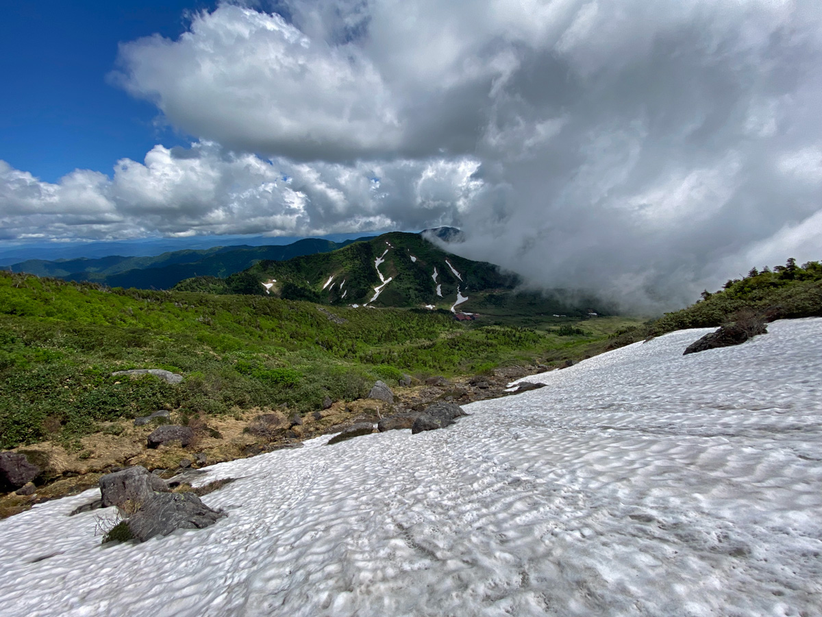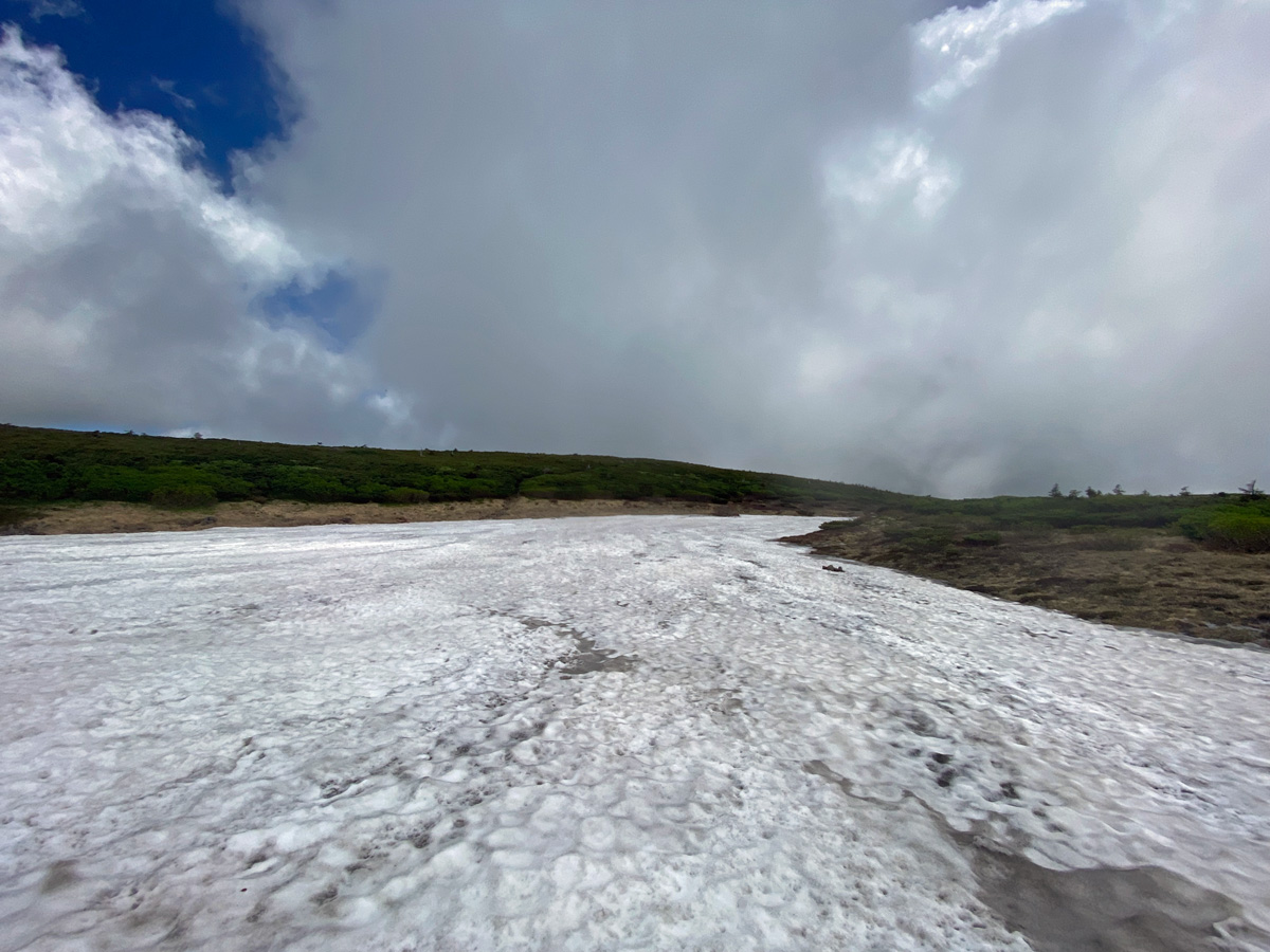 下山は、当初エコーラインを下る予定でしたが、意外と早く行動できていたので、少し遠回りとなるトンビ岩コースを下山道としました。トンビ岩コースは初めて通るルートで楽しみでしたが、いきなり雪渓が出現して道がない、、、少し焦って道迷いしかけました(^_^;