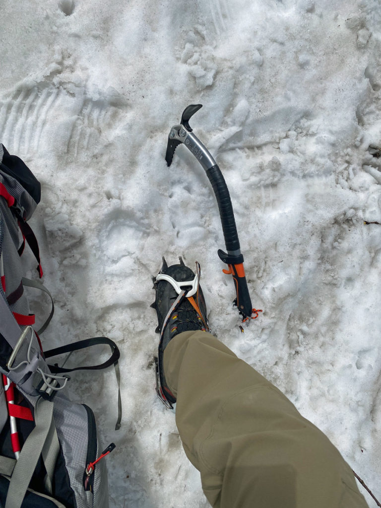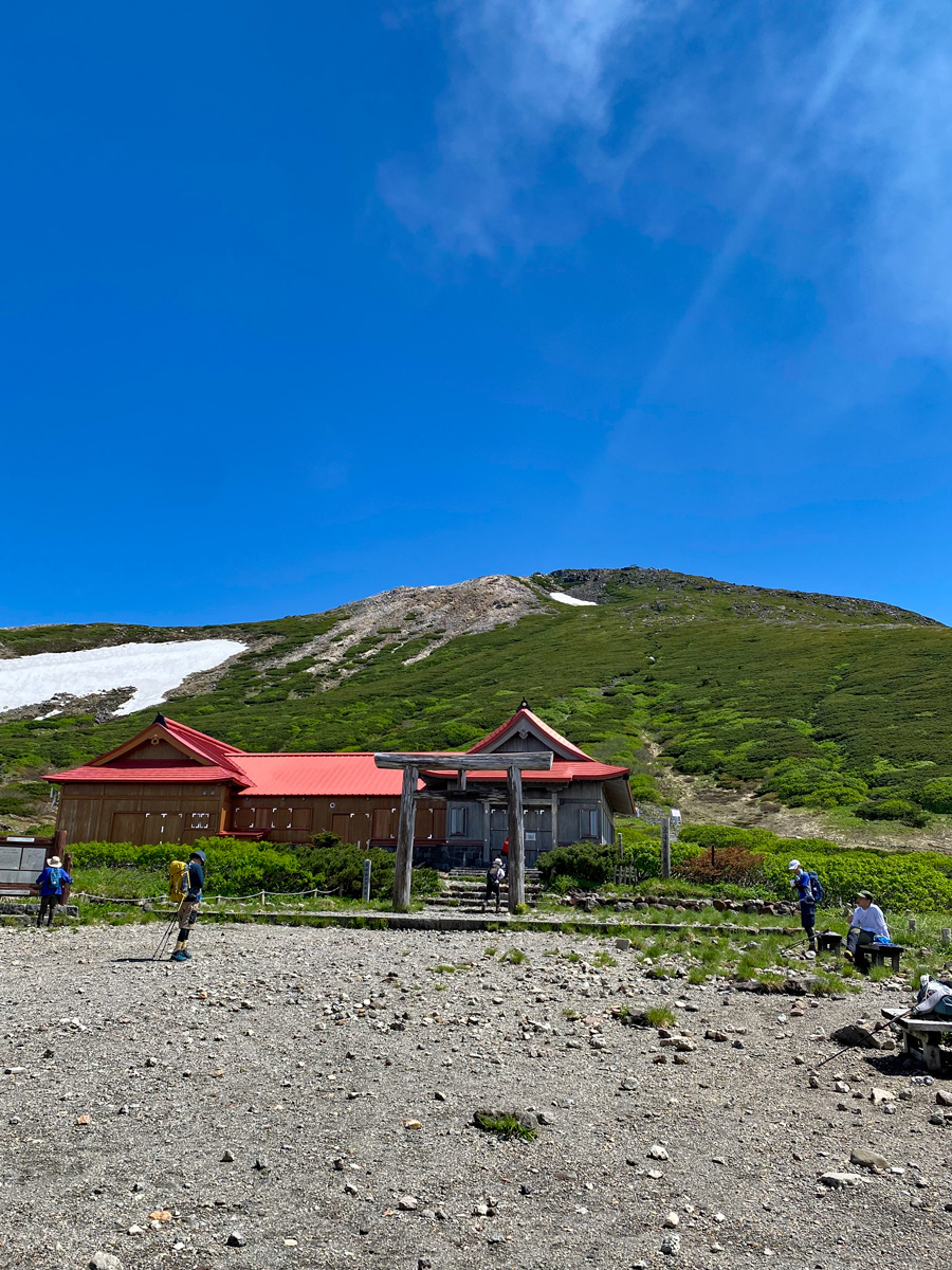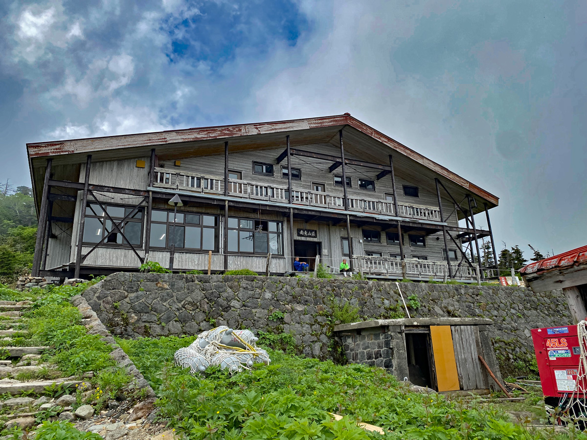 更に下へ降りると急傾斜の雪渓があったので、そこで12本爪アイゼンとアイスアックス(ピッケル)を装着し降りました(アイゼン無いと降りるのはかなり難しそう。。。)夏の北アルプス雪渓での滑落停止訓練にちょうど良さそうでし。更に降りると営業前の南竜山荘に到着。準備されている方へお願いしてトイレをお借りしました。ありがとうございました。