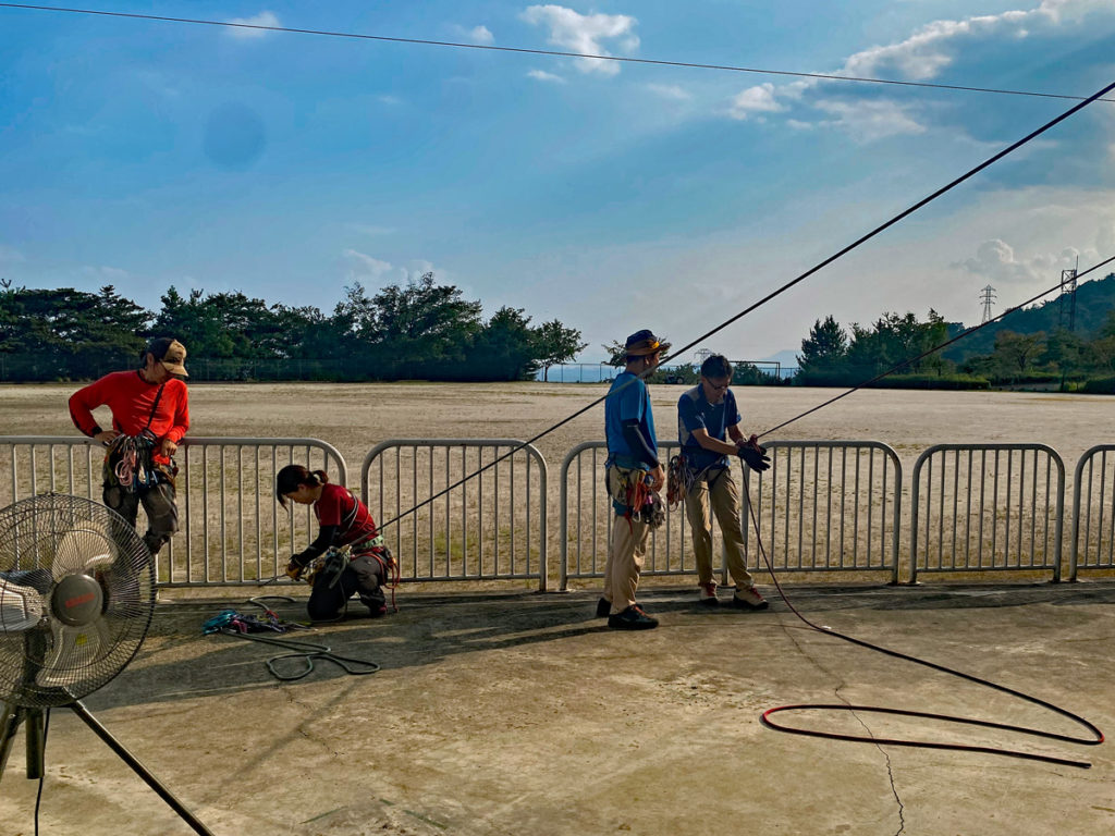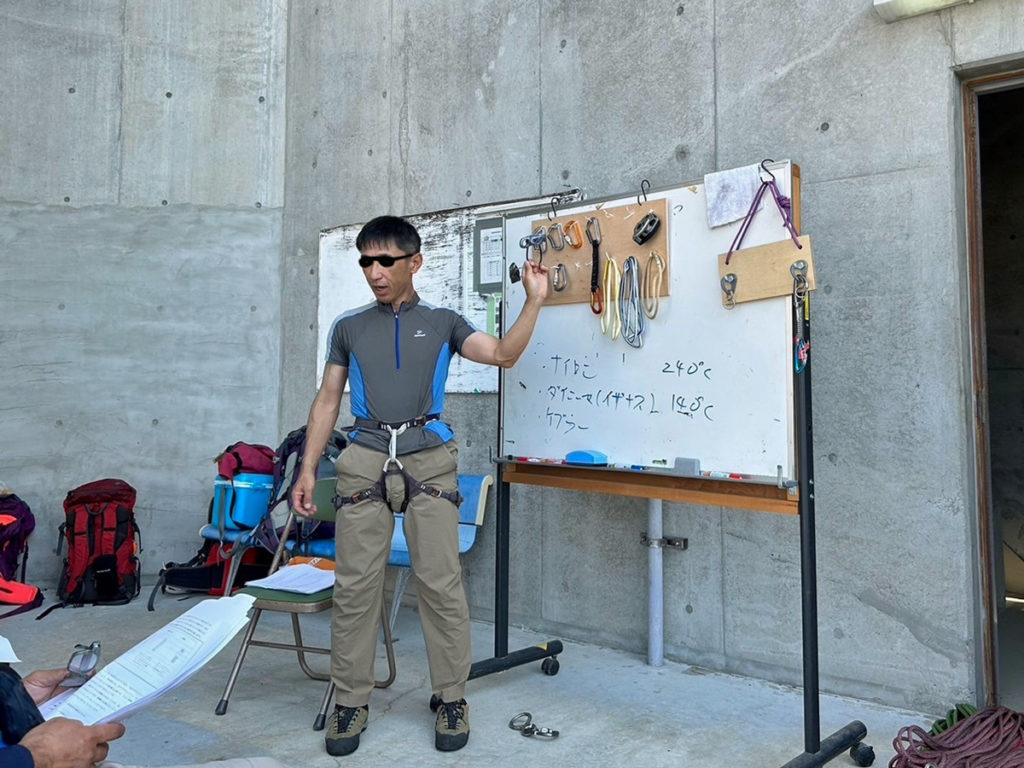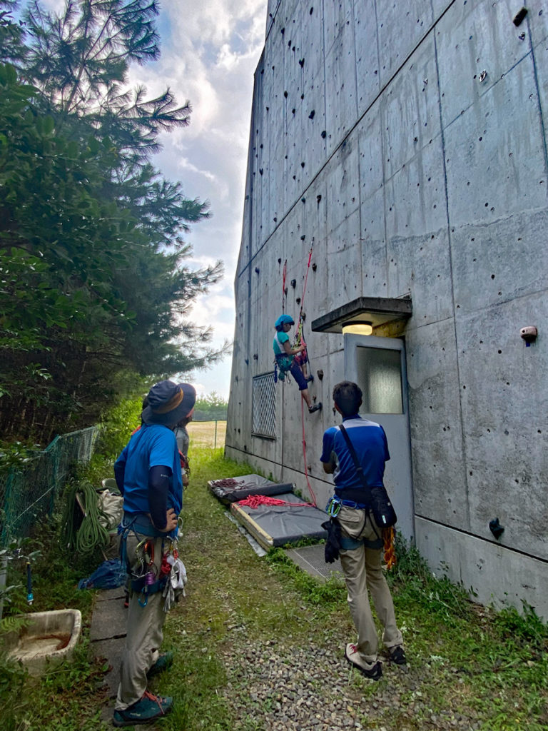 30℃越えの猛暑での研修となり、参加者が熱中症にならないよう、一時的に人工壁裏の日陰に待避し休憩しながら進めて大変だった。内容的には、八日市山の会で毎年実施しているクライミングセルフレスキュー技術研修会と同様のカリキュラムとしたが、一般公募の研修会であるため、基本技術の説明や実践にウエイトを置いた内容で、実践的で身になるように心がけた。参加者同士が教え合って、スタッフも適材適所で立ち回ってもらえたので良かった。登下降の講師デモが少し失敗したのはご愛敬だったが更に技術を磨いて、より適切な指導ができるようにしたい。