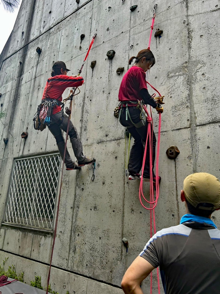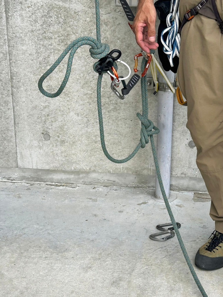 ①ノットとヒッチ②アンカー構築③ビレイデバイスの使用の仕方④仮固定⑤懸垂下降のパーツの指導と実践を経て、パーツの基礎的な組合せとして⑥登下降の指導と実践を行った。