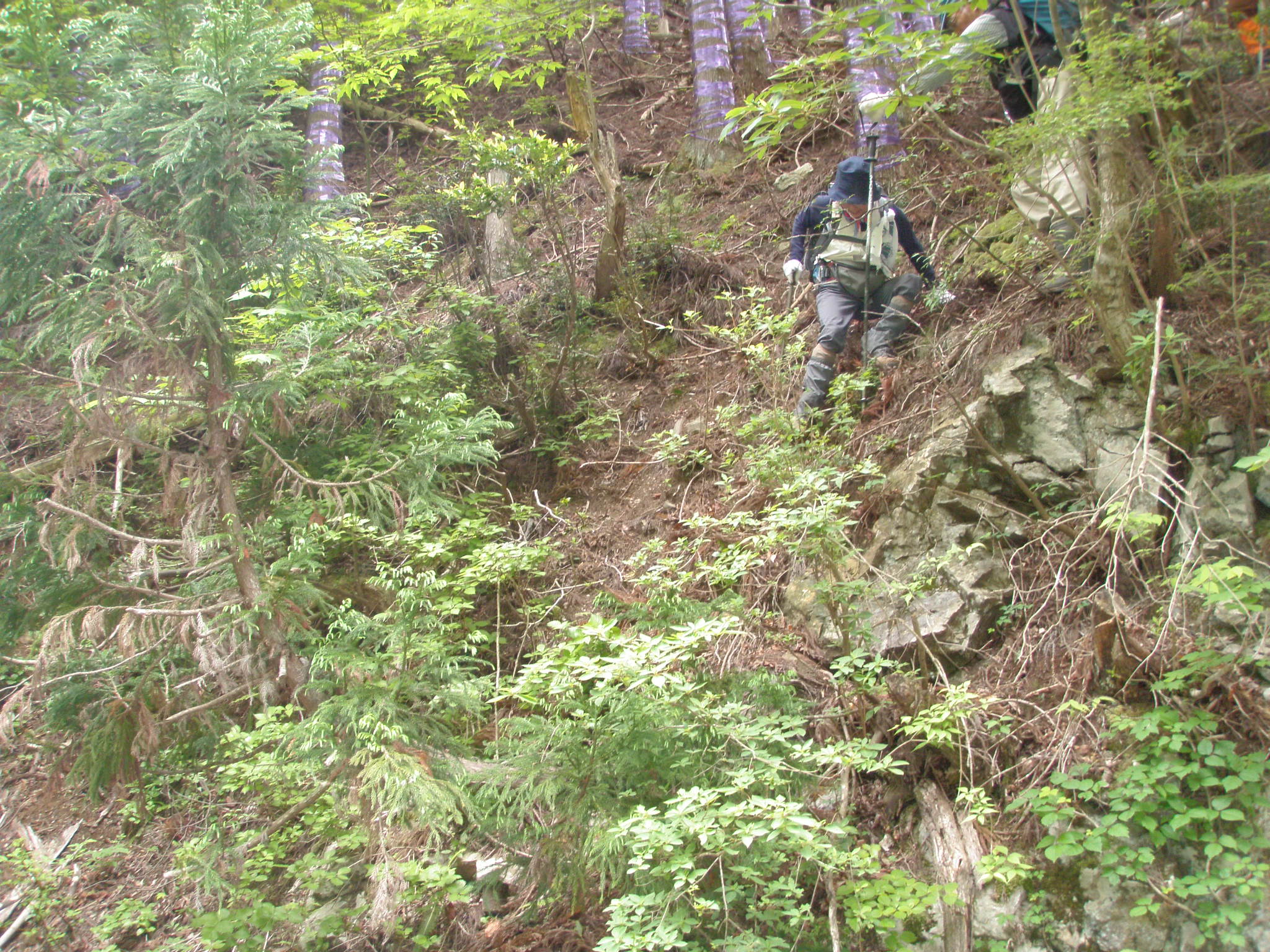 降りの尾根の乗り換えは、超難しいです。登山道は有りませんので、何度も現在地を割り出して、コンパスで進行方向を探りました。