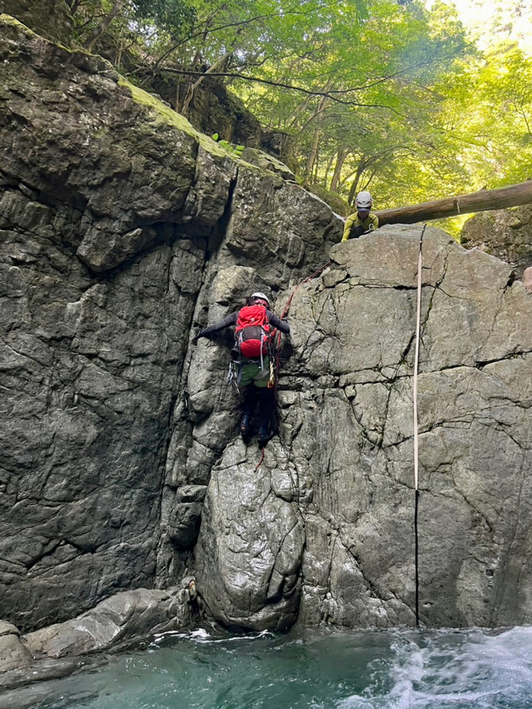 3〜4年ぶりで超久しぶりの渋川での沢登りに6名の参加となった。堰堤からの入渓に少し迷ってしまい懸垂下降箇所もあったので少し時間はかかったが、F1(2m)に到着。M戸が先行して登攀し、カムを残置してお助け用として登ってもらった。F2は8mの大滝で毎度のことながら左側を高巻き。F3(3m)はいつもは登攀できるものの水量多く断念して高巻き。F4(3m)は皆さん難なくクリアして核心部のF5(3m)へ。最初は、M戸がショルダーで登って、ボルト支点からロープセットして後続に登ってもらうものの結構時間がかかってしまい後続パーティに追いつかれてしまった。何とか全員登って、トロではへつって前進し、F6(5m)を登って橋の下の終了点。
