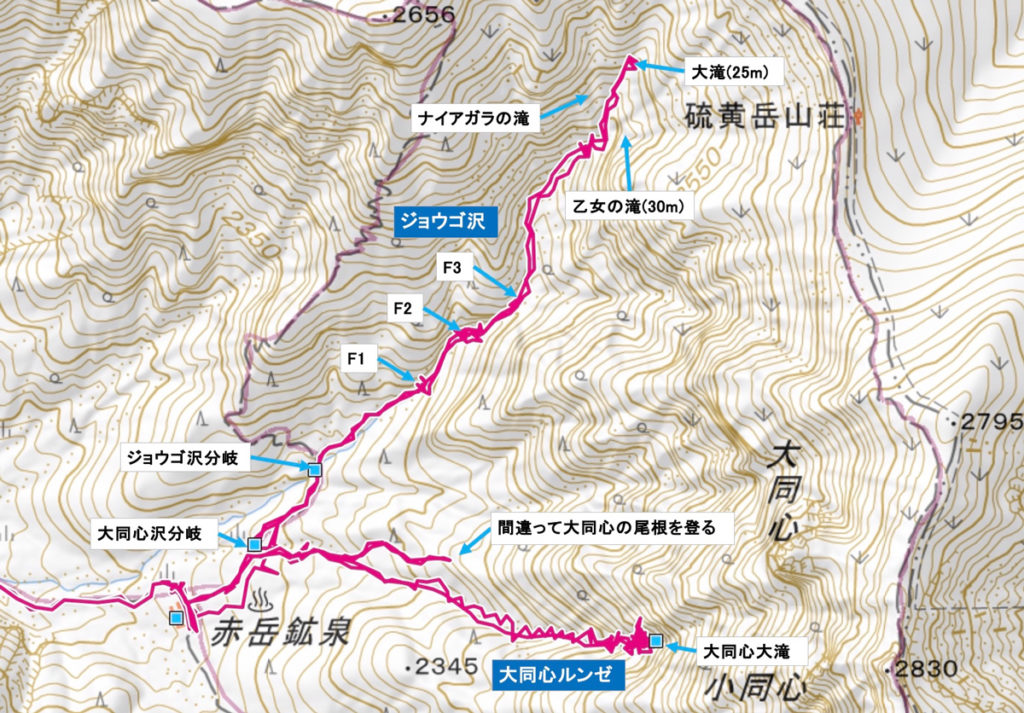 赤岳山荘駐車場5:31発 → 堰堤広場 6:57着(小休止) → 赤岳鉱泉 8:09着(大休止・登攀装備装着) 9:12発 → 大同心沢分岐 9:19着 → ジョウゴ沢入口 9:35着 → F1取付 9:50着 登攀開始 10:09発 → F2 10:50着 → 乙女の滝 12:50着 → 大滝13:40着 先行パーティが遅くなりそうなので途中撤退 14:10発 → ジョウゴ沢入口 15:20着 → 赤岳鉱泉 15:30着
