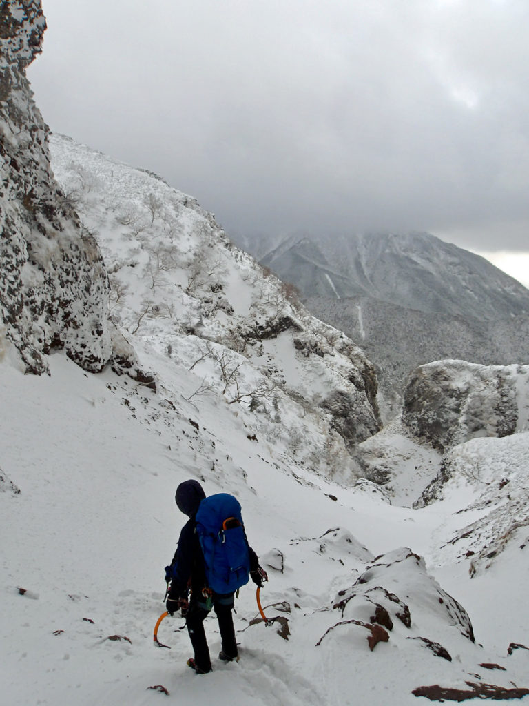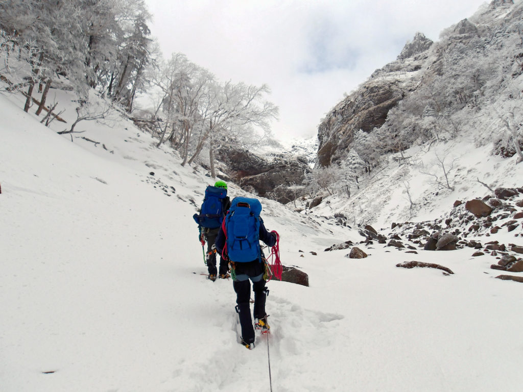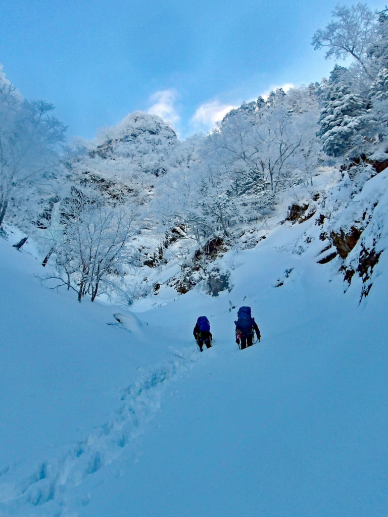 少し登攀気味にあがっていくと、全く踏み跡が無くラッセルしながら上がっていくことになりました。道間違い&ラッセルにより、到着が9時30分になってしまったので大同心まで登ることは断念し、大滝を登ったら懸垂下降し、下山することにしました。
