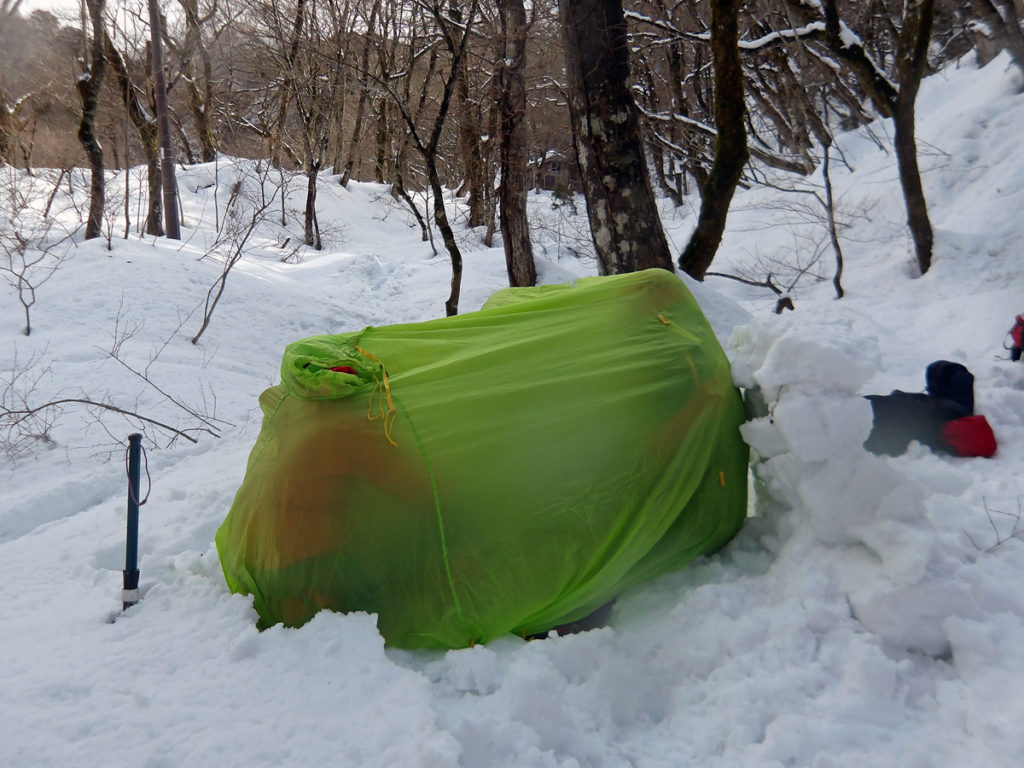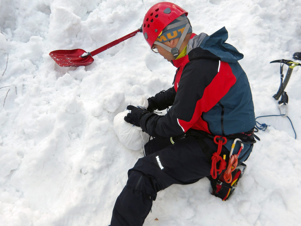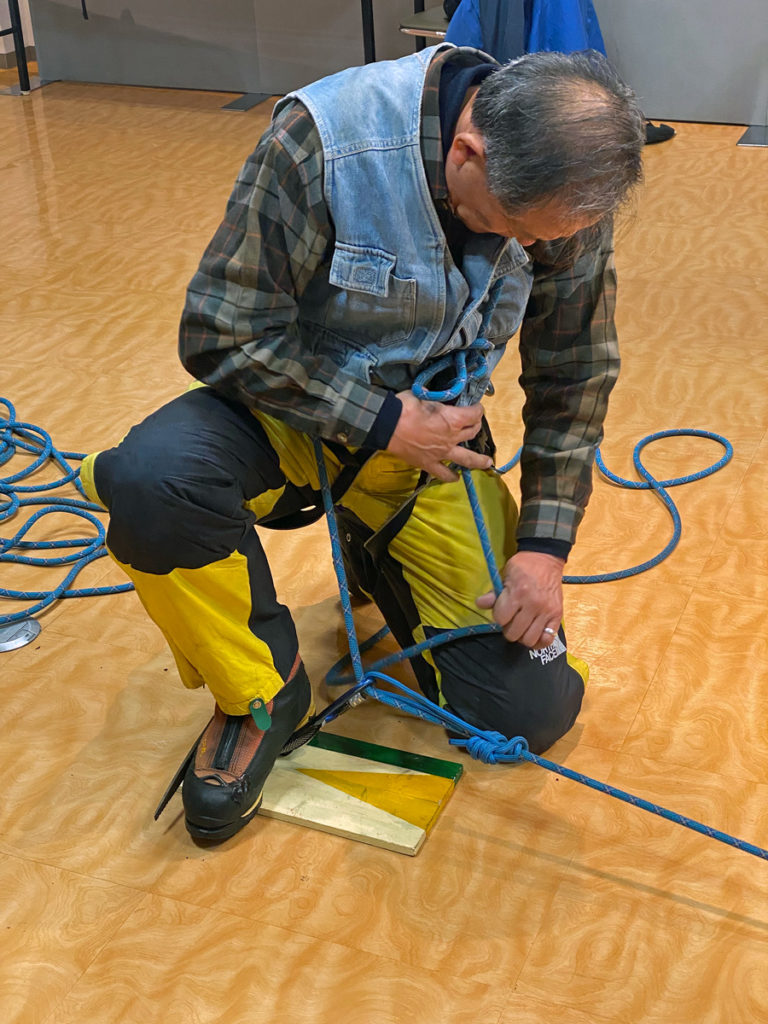 主に、SAB(スタンディングアックスビレイ)からの自己脱出、滑落停止、支点構築(スノーバー、土嚢袋)、緊急ビバーグ、雪上歩行などを机上と実技で講習