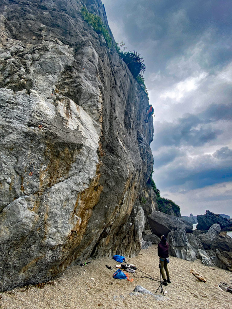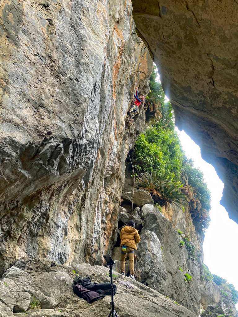 定番のヤンバルクイナ展望台にある超ビックなヤンバルクイナを見た後で(笑)宇佐浜の駐車場に車を駐めて、宇佐浜の入口から浜沿いに西方向へ10分程歩くとクライミングエリアがありました。大阪から遠征に来たとおっしゃっていた6人程のクライマーの皆さんが登っていました。