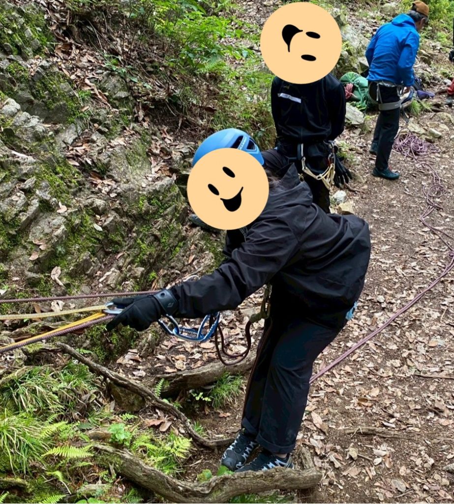 今後、マルチピッチルートに挑戦するために、今回はM戸氏からマルチピッチクライミングの基礎について指導を受けました。特に今回は、懸垂下降についての説明と実践を行いました。