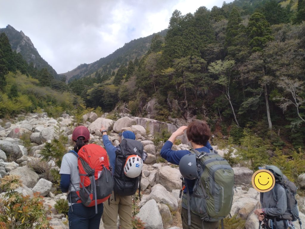 最終ポイントを抜けたら、7合目地点→兜岩→立岩と移動して昼休憩に。充分に休んだら下山します。途中、スポートクライミングまでのルートへ入ったり、道に迷ったり、落ち葉に足を滑らせて肝を冷やしたりしながらも無事藤内小屋まで辿り着き、山を下りました。
