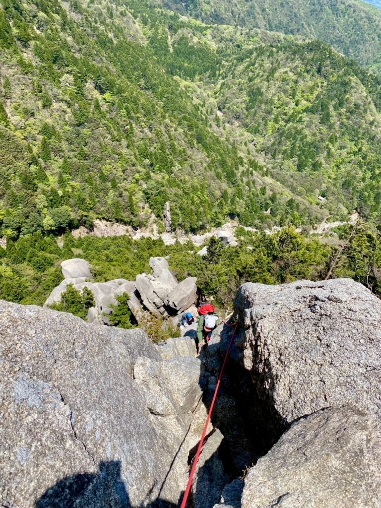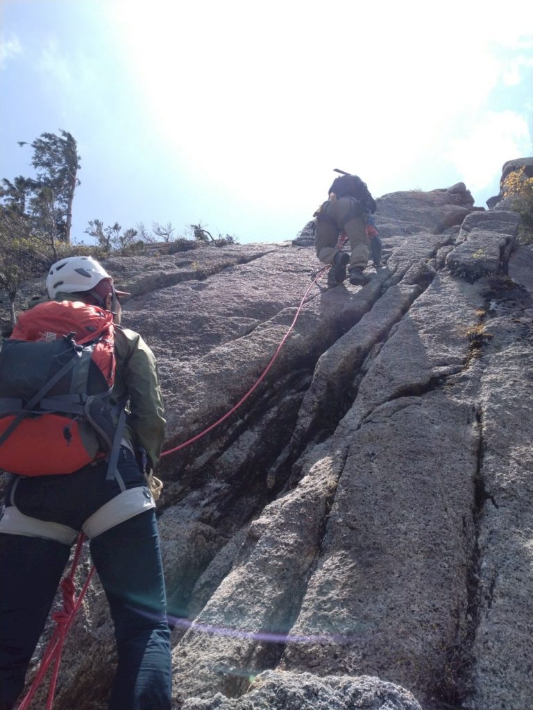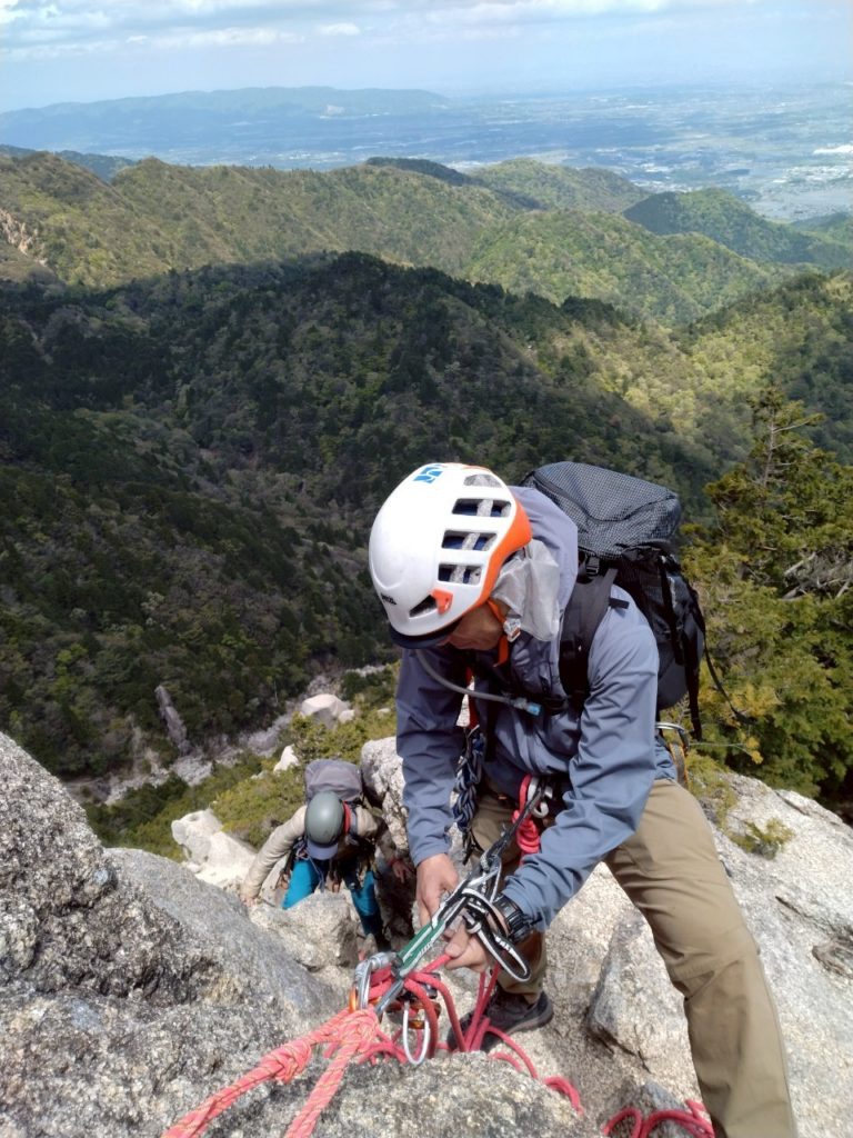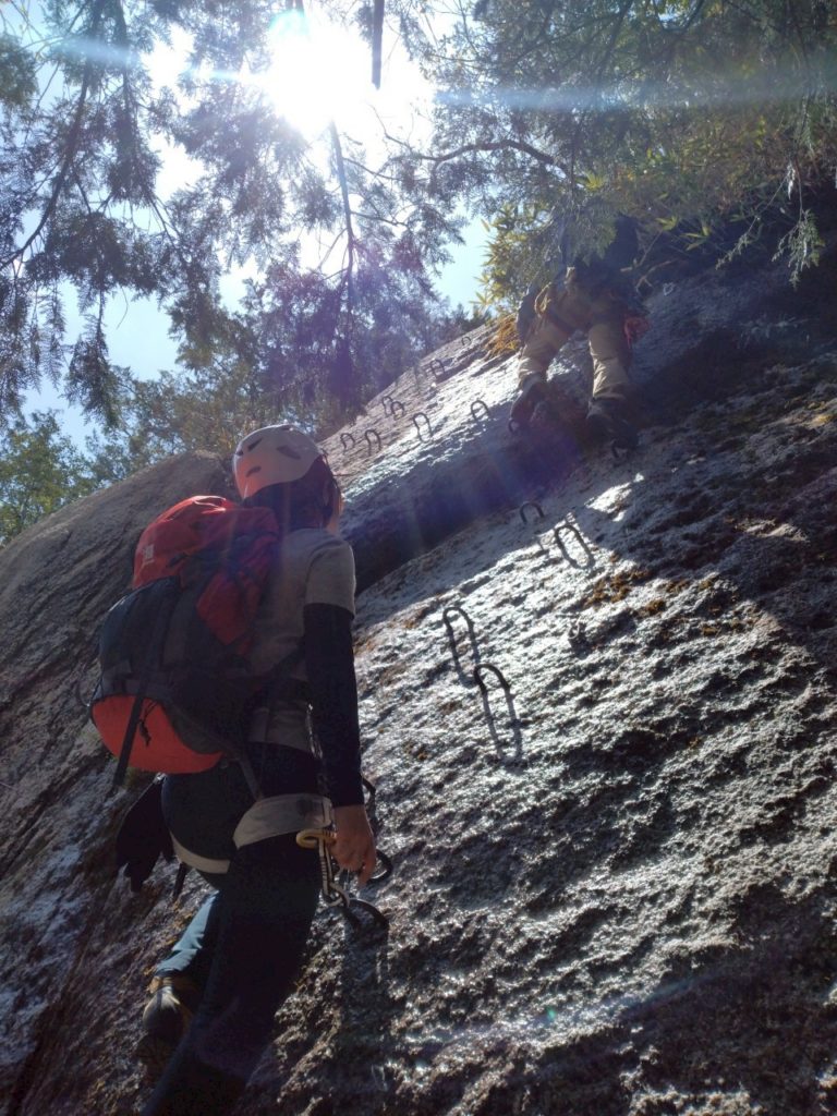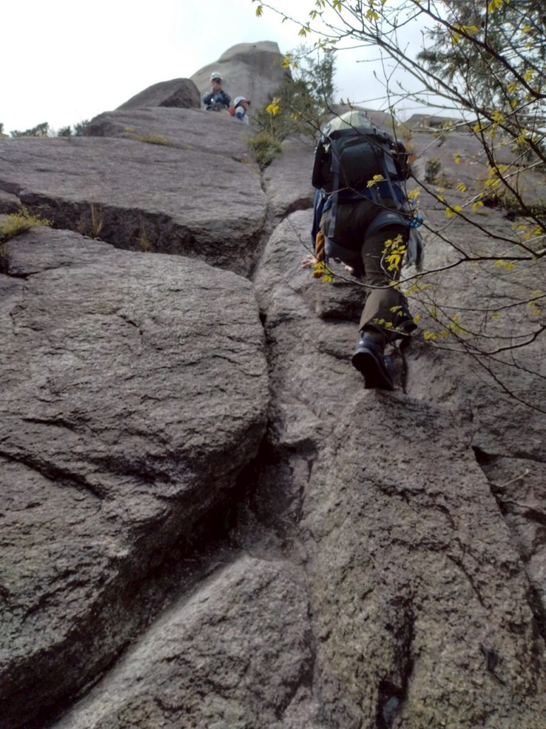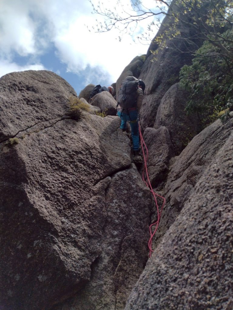 装備が整ったところで最初のポイント、大きなホッチキスを登ります。手足の置き場が明確なので難しいルートではありませんが、前夜が雨で岩場が濡れていたため、ロープを出してもらうことに。岩場を登る際は一人ずつ登り順番待ち=休憩時間が発生するので、このあたりから体力不足は気にならなくなりました。