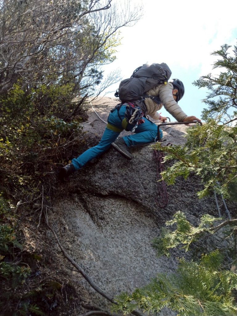 ルートに取り付いたらハーネスやカラビナを装着します。ハーネスを付けるとリュックの腰ベルトを締めにくくなりますが、ベルトを裏返してリュックに巻き付けるように締めると邪魔にならないそうです。