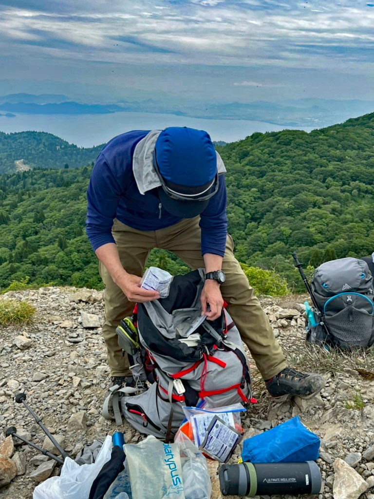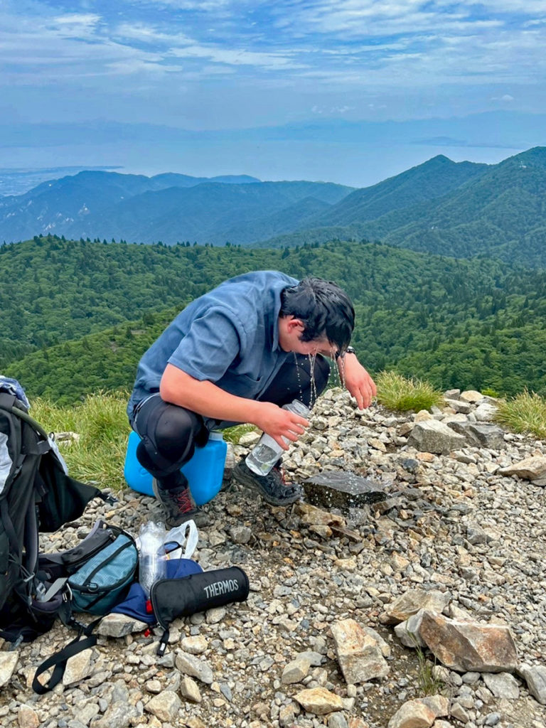 山頂では、Y口さんは担ぎ上げた水はほとんど抜きながら水浴びもして(笑)、8kgまで荷物を減量。他の皆さんは、水分補給した分は荷物を減量。M戸は下山開始時は18kgスタートでした。